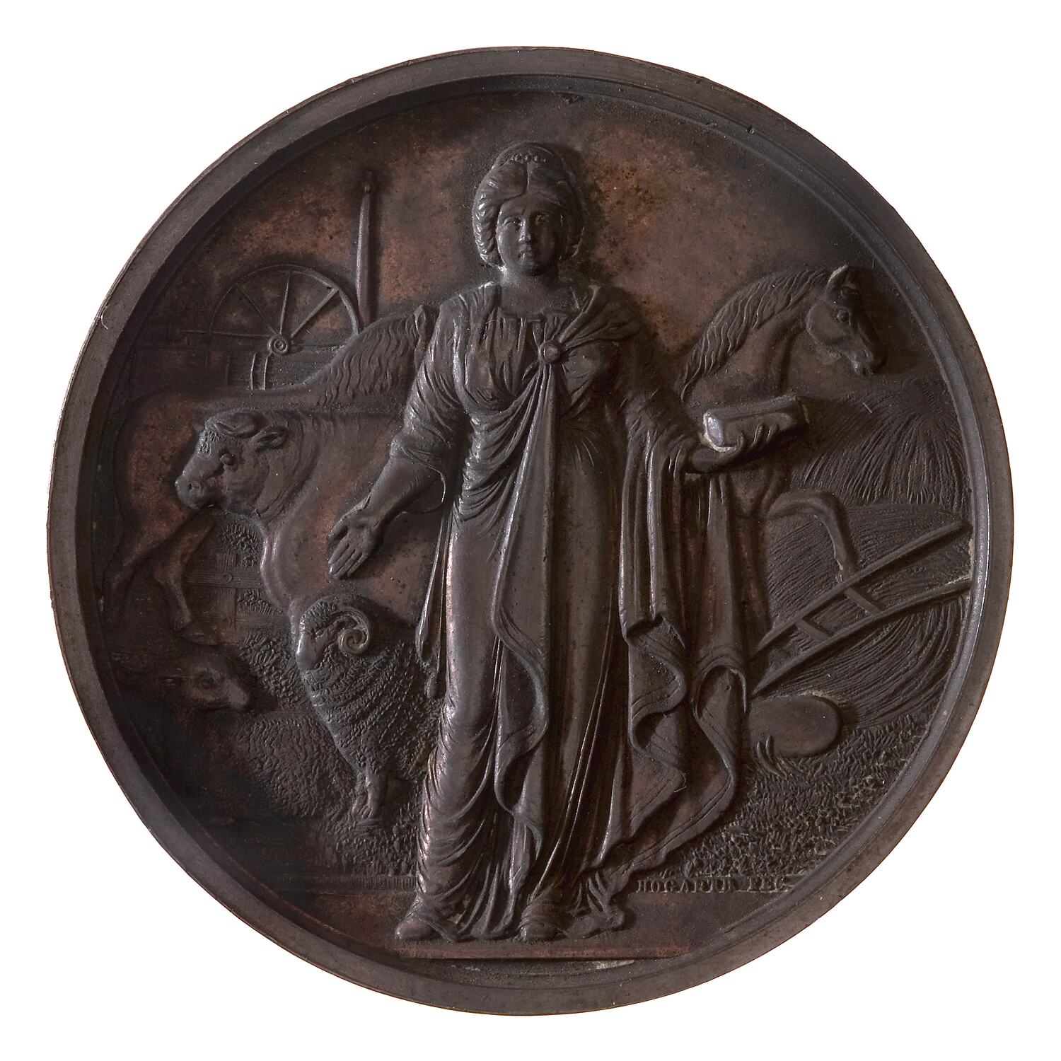 Victoria standing facing holding a block of butter and surrounded by agricultural scene which includes two horses, two sheep a bull a plough and a traction Engine. The artist's name HOGARTH FEC. (Trans.: Hogarth he made it) above the exergue on right.