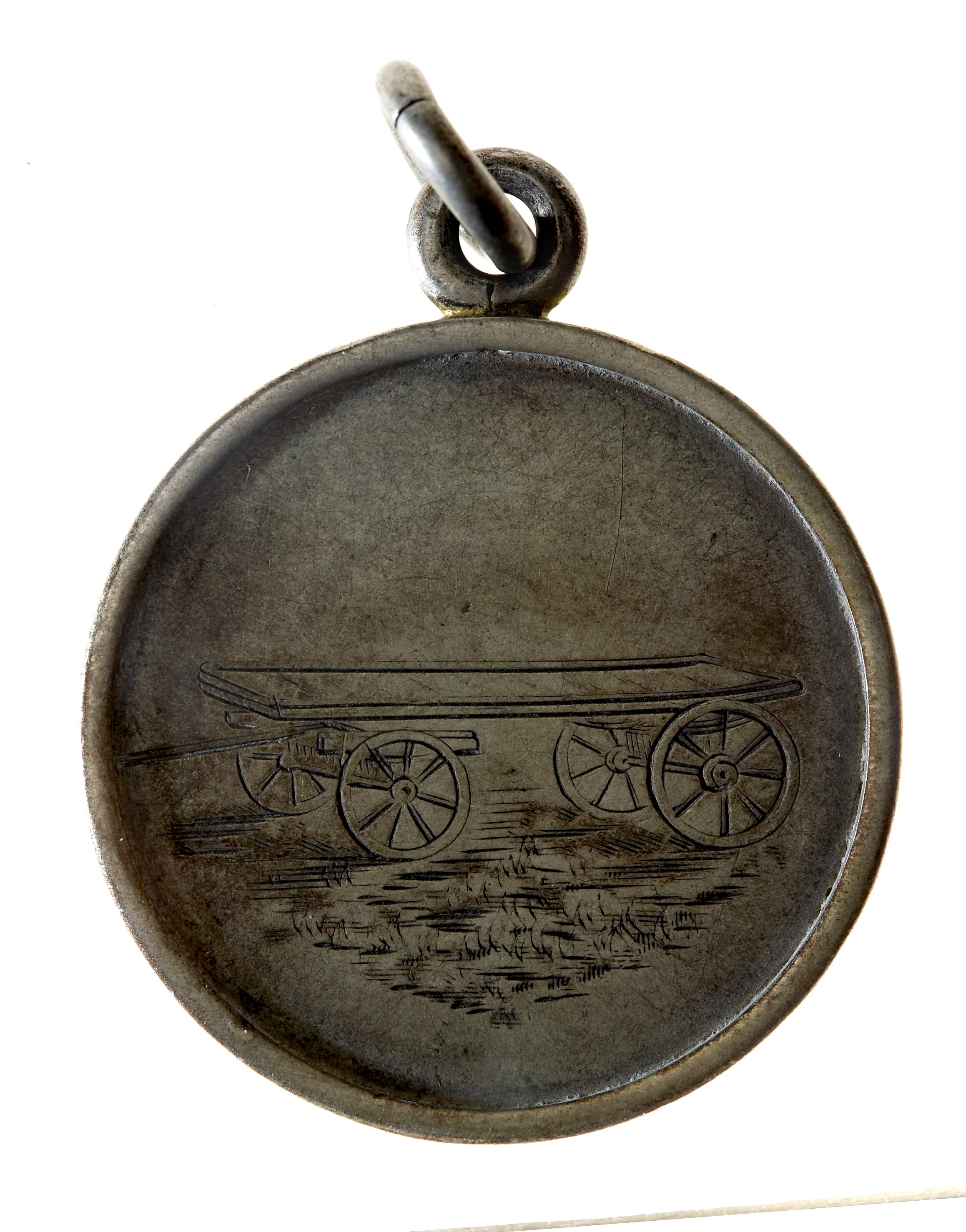 A silver prize medal (32 mm diameter with loop and ring at top) manufactured by engraving. It features an engraved lorry cartand details of the society and award around an engraved wreath.