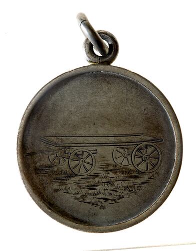 Engraved around an engraved wreath, THE NATIONAL AGRICULTURAL SOCIETY OF VICTORIA; engraved within wreath, AWARDED TO / R.H. Whyte / Age 18 Years / OF NORTH MELBOURNE / as / SPECIAL PRIZE / FOR / MODEL OF LORRY / 1887
