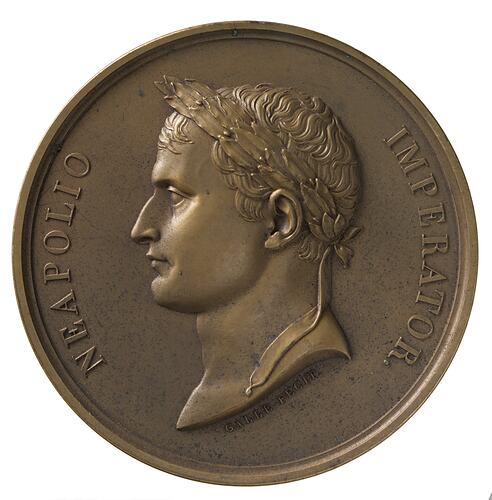 The Emperor in ancient Roman armour seated on an elevated platform facing right; in his left hand the staff of royalty surmounted by the eagle of France; on right, the city of Pari wearing turreted crown facing Napoleon, arms extended; behind her, on the right, an antique ship, with a Cupid holding the rudder; his head is turned to look at a star bearing the letter N placed on the upper field; around above, TVTELA PRAESENS; in exergue, EPVLVM SOLLEMNE / IMPERATORIS IN CVRIA / VRBANA . FRIM . A . XIII. ; at sides of exergue line, names of the artists, PRUDMON DEL. JEUFFROY FEC.