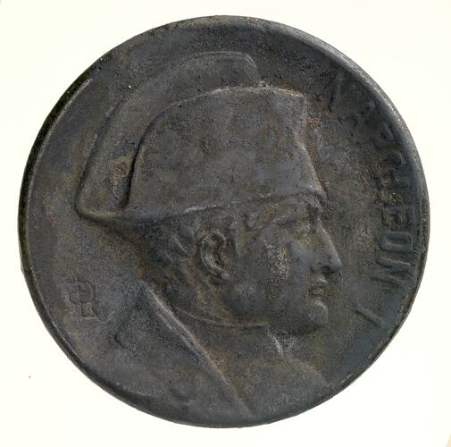 Round darkened white metal medal, blank on the reverse. Obverse depicts the head of Napoleon facing right, inscription on right. Possibly artist's initials on the left.