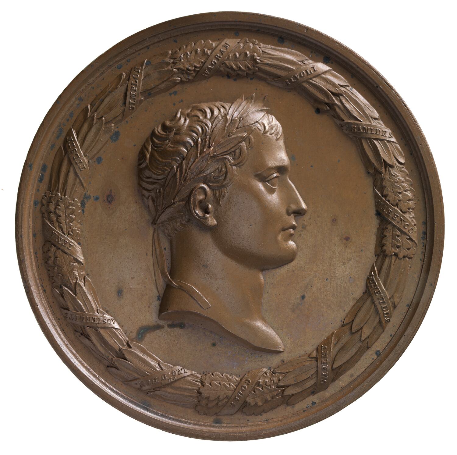 Within a closed wreath, laureate head of Napoleon facing right