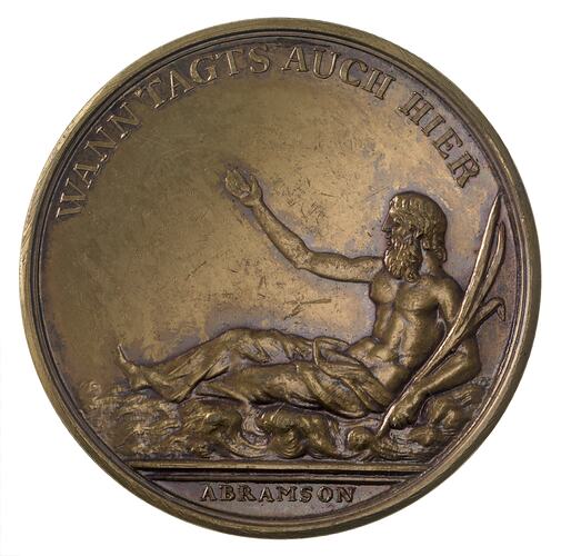 River god seated in river facing left, right arm raised; around above, WANNTAGS AUCH HIER; in exergue, ABRAMSON