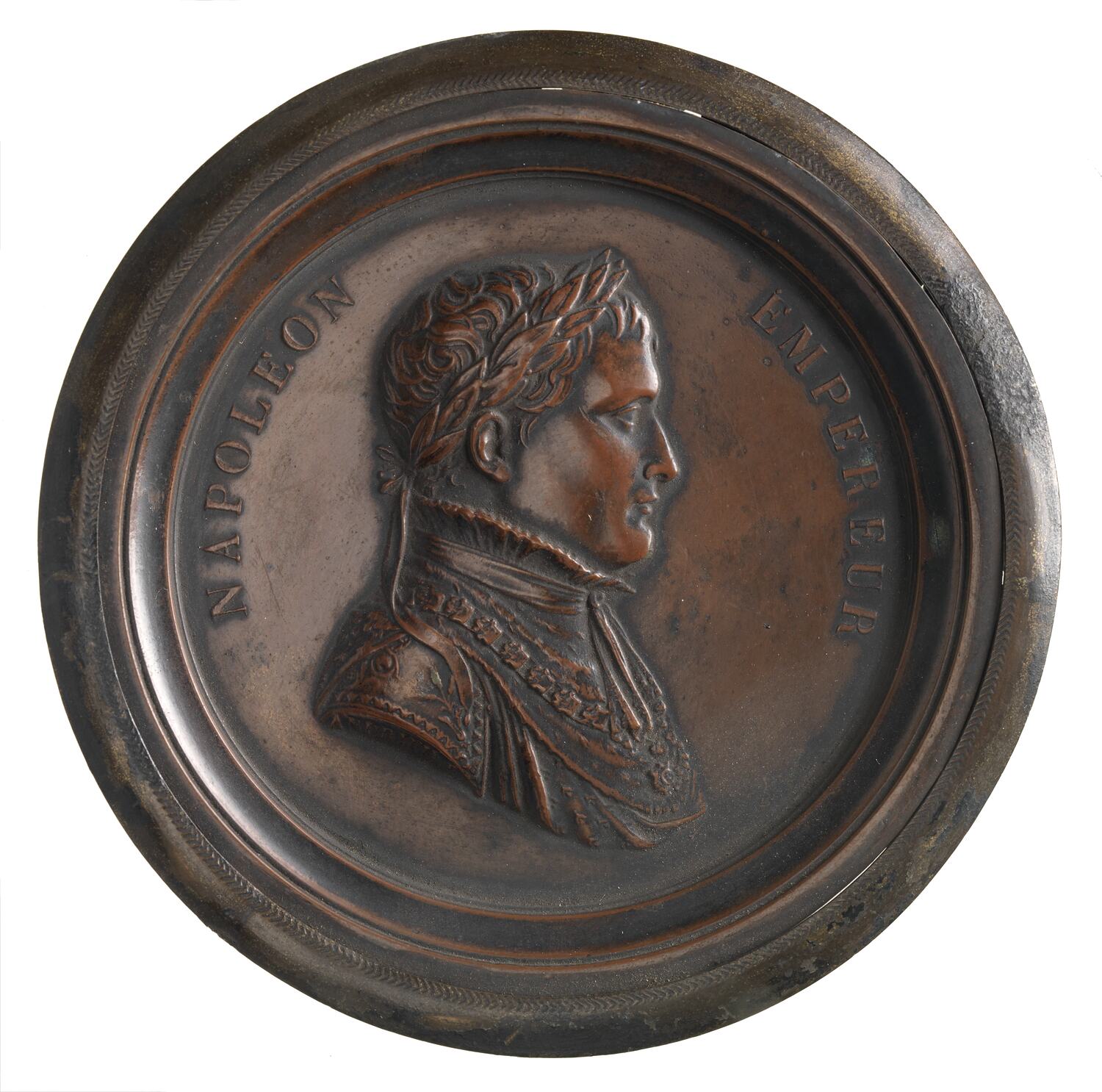 Electroformed uniface Portrait medal of Napoleon, by Bertrand Andrieu, Issued by France. The medal has been joined by a circular frame with lugs on the back, may have been designed to be incorporated in a piece of furniture or a book cover.