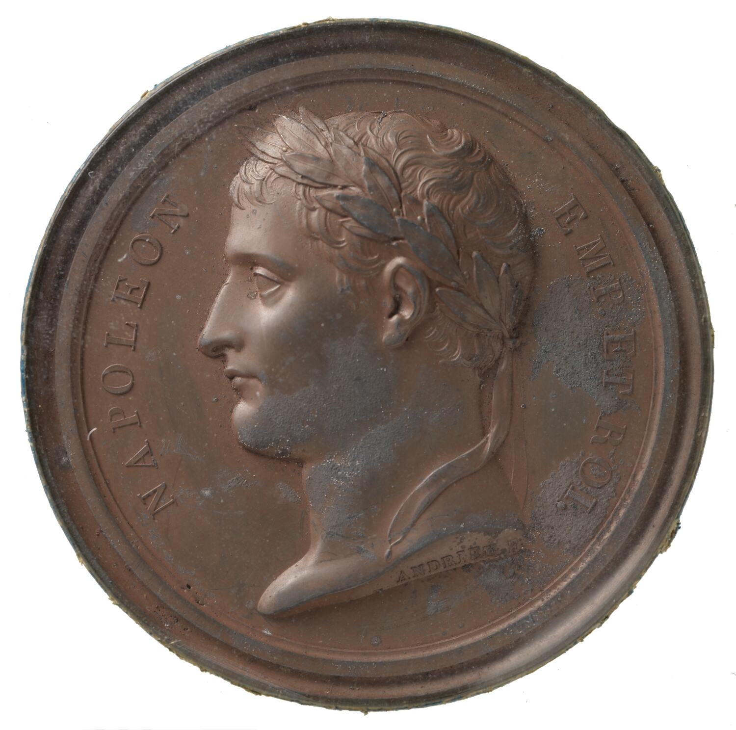Laureate head of Napoleon facing left; around, NAPOLEON EMP. ET ROI.; on truncation, ANDRIEU F.