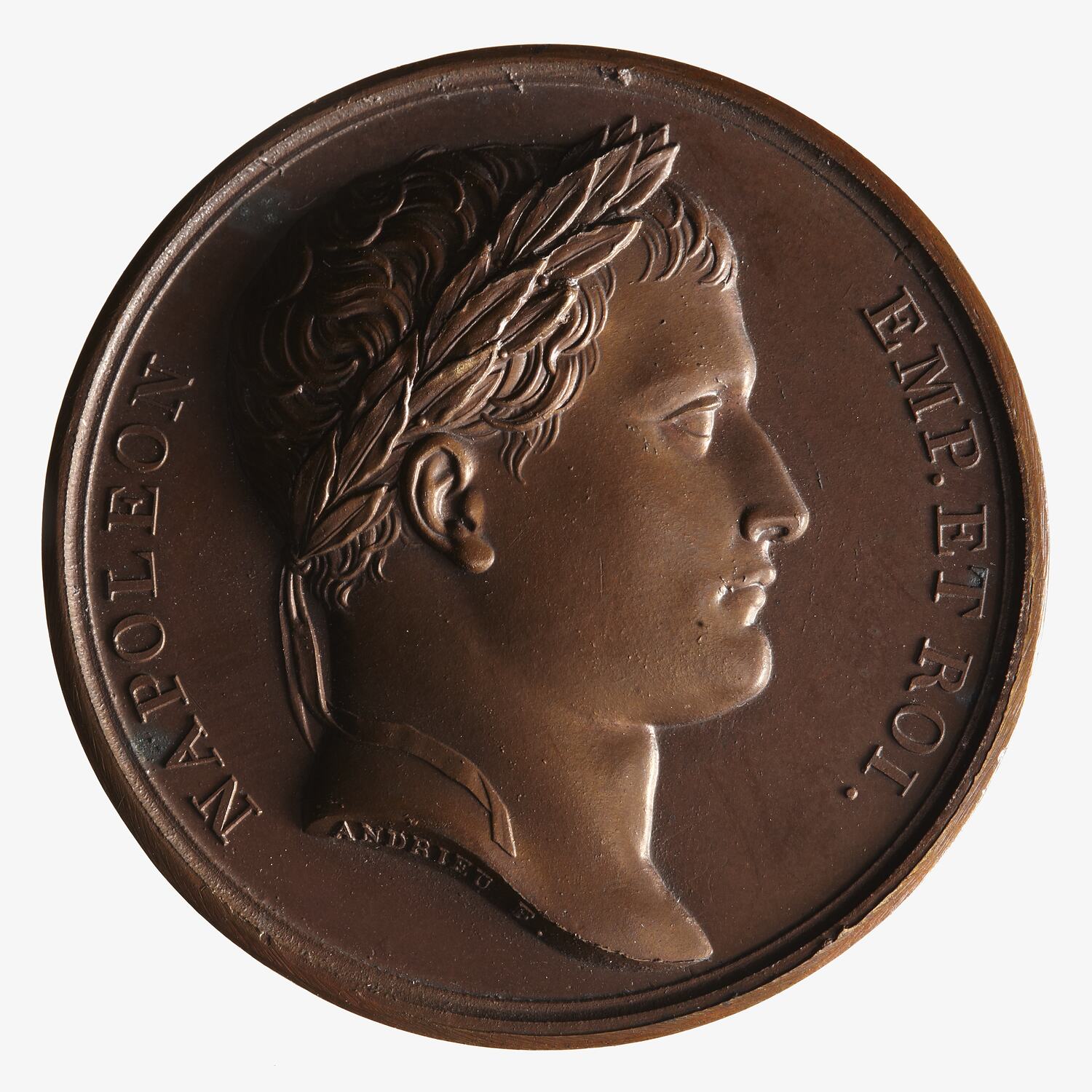 Laureate head facing right; around, NAPOLEON EMP. ET ROI.; on neck truncation, ANDRIEU F.