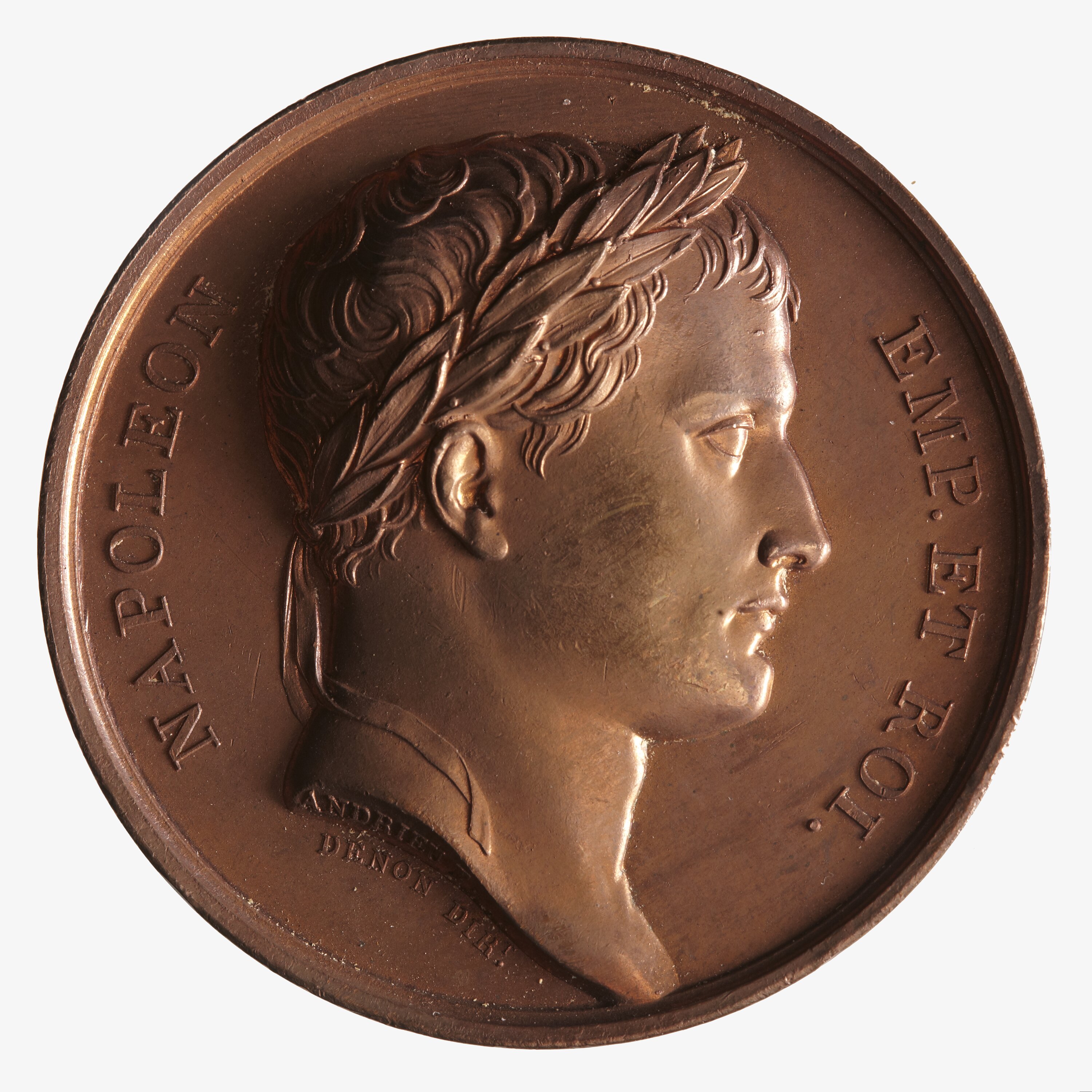 Laureate head facing right; around NAPOLEON EMP ET ROI.; on neck truncation, ANDRIEU F.; below, DENON DIRT.