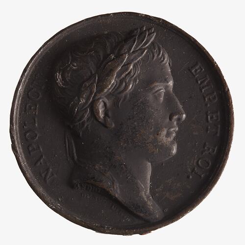Laureate head facing right; around NAPOLEON EMP ET ROI.; on neck truncation, ANDRIEU F.; below, DENON DIRT.