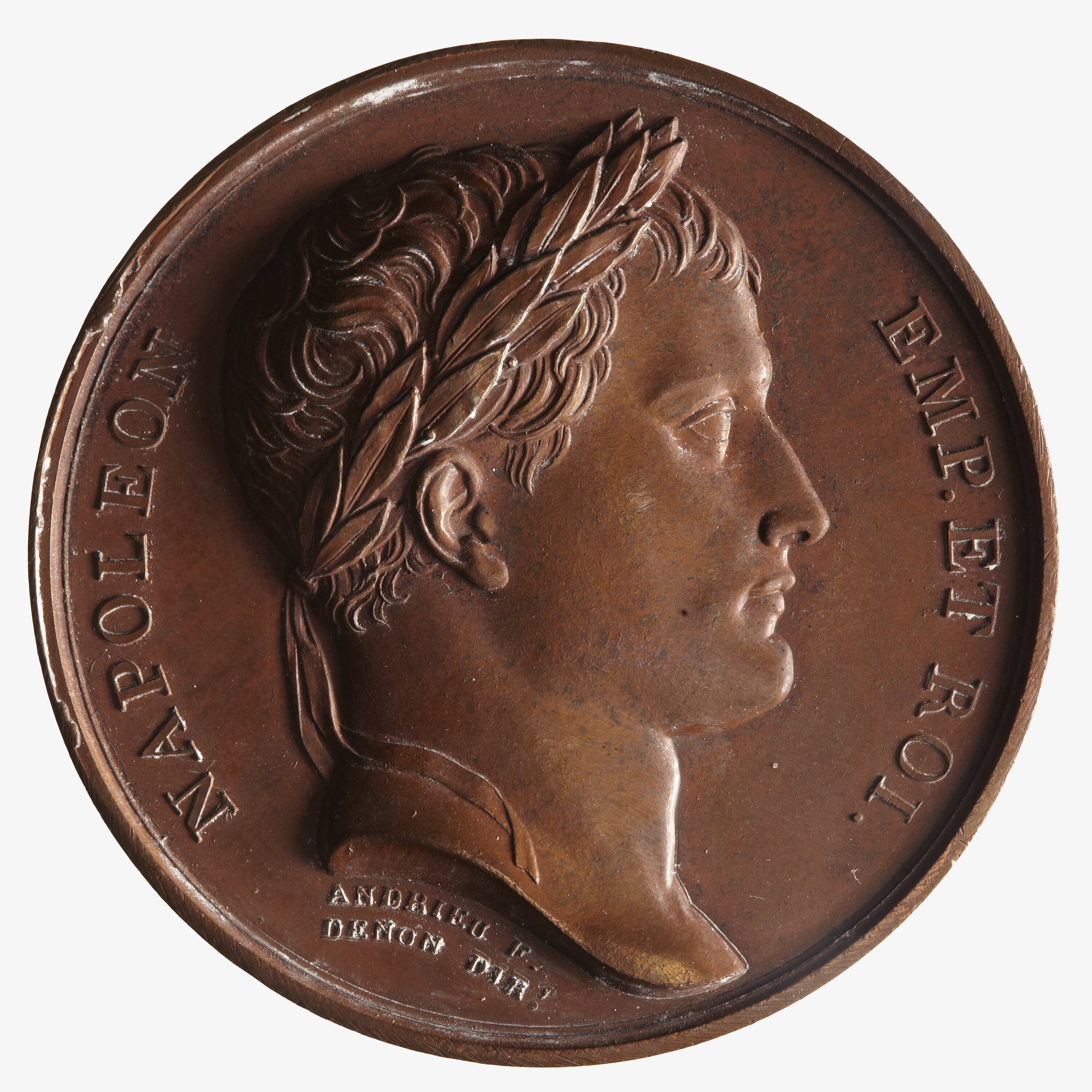 Laureate head facing right; around, NAPOLEON EMP ET ROI; below in small lettering, ANDRIEU F. / DENON DIRT.