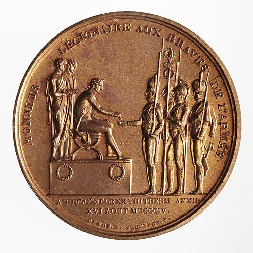 Napoleon, head laureated, and in the uniform of a General, seated on an elevated platform, on the front of which are two laurel wreaths; he is in the act of distributing the insignia of the Legion of Honour to four soldiers of different corps and ranks in the service who stand on the right facing the Emperor; behind the Emperor, two attendants, one of which holds the crosses of the order to be distributed; around, HONNEUR LEGIONAIRE AUX BRAVES DE L'ARMEE; in exergue, A BOULOGNE LE XXVIII THERM. AN XII. / XVI AOUT. MDCCCIV. / DENON . D. JEUFFROY . F