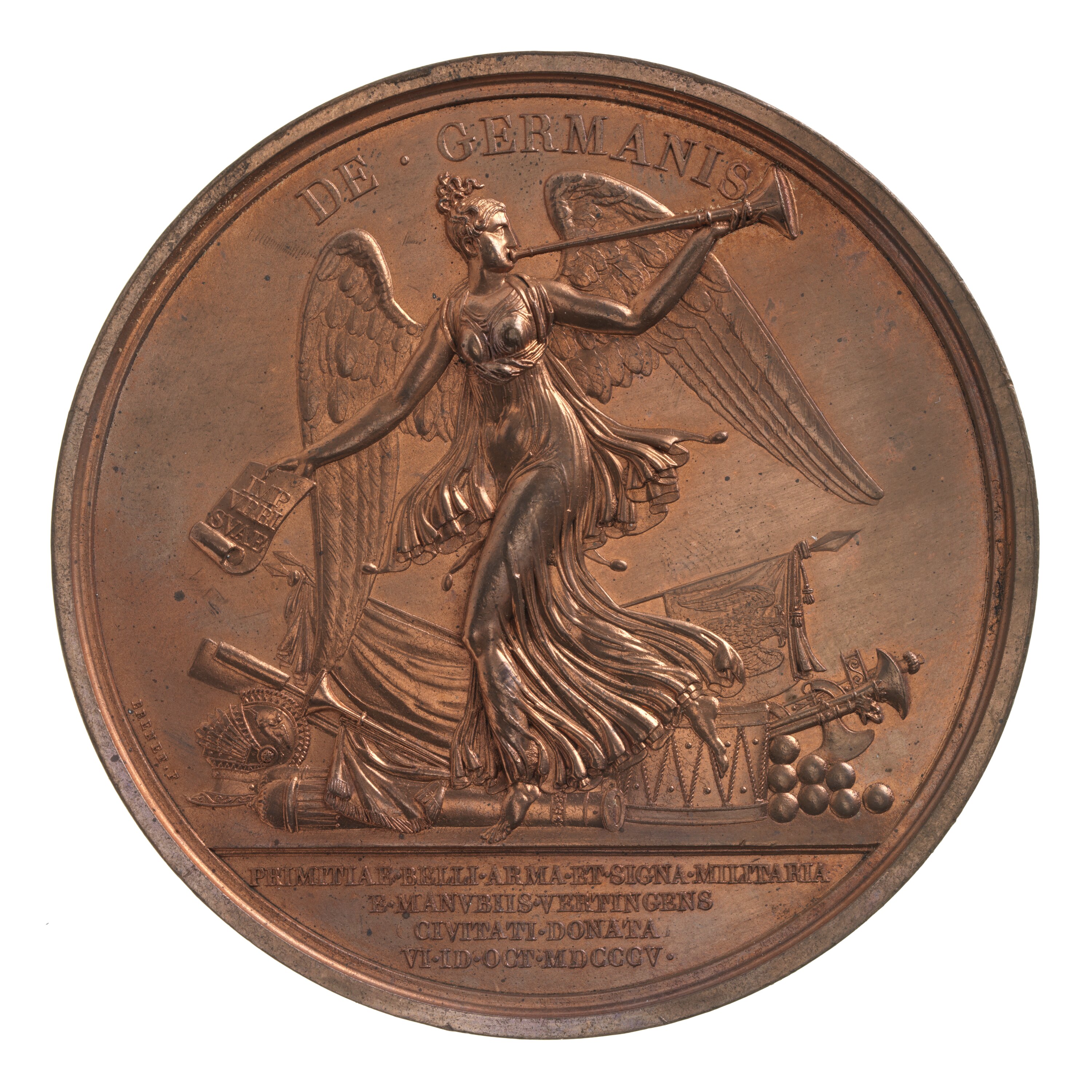 Winged Victory advancing to left but looking back while sounding her trumpet, in her right hand, a scroll in her right on which, IMP / VRBI / SVAE; on the ground about, emblems of war - standards, artillery, drums, casques, cannon balls; around above, DE . GERMANIS; in exergue, PRIMITIAE . BELLI . ARMA . ET . SIGNA . MILITARIA / E . MANVBIIS . VERTINGENS / CIVITATI . DONATA / VI . ID . OCT. MDCCCV. ; in small lerrering nea rim above the left of the exergue line, BRENET. F