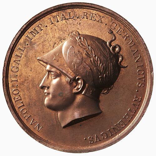 Helmeted head of Napoleon facing left; the visor of the helmet bears Napoleon's star, it's body is laureate with a flying eagle below and a fulmen above; on top of the helmet, a curled snake striking; around, NAPOLEO . I . GALL . IMP . ITAL . REX . GERMANICVS . RVTHENICVS .; on neck truncation the artist's initials, L.M.