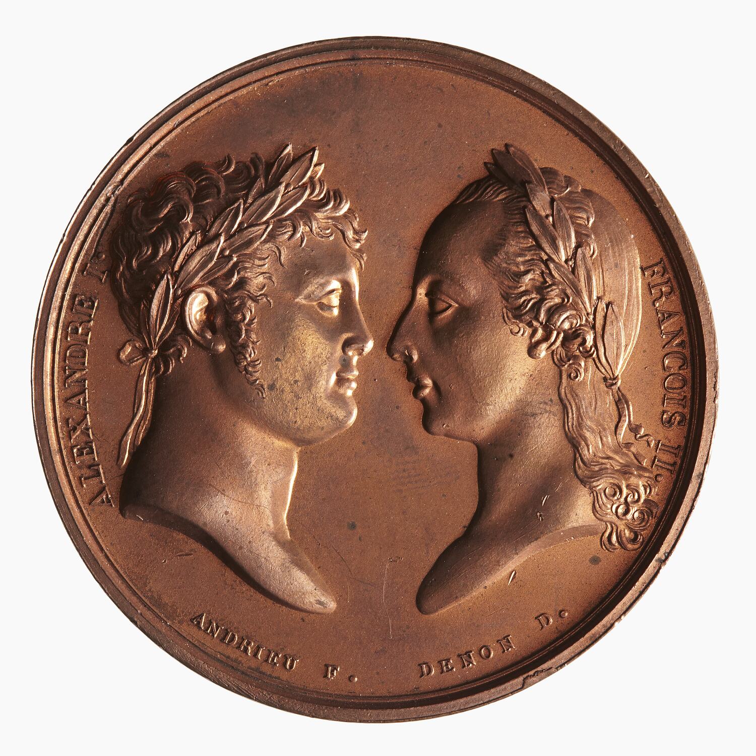 Laureate heads facing each other; around, ALEXANRDRE I. FRANCOIS.II; below in small lettering, ANDRIEU F. DENON D.