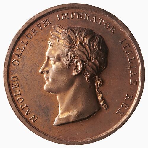 Laureate head of Napoleon facing left; around, NAPOLEON GALLORVM IMPERATOR ITALIAE REX; on neck truncation the artist's initials, L.M.