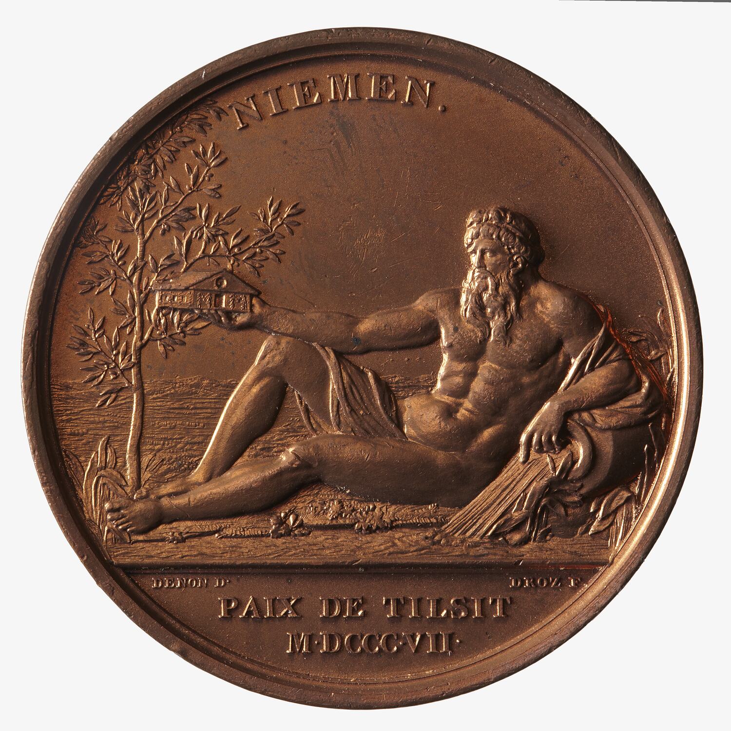River god Niemen reclining to left his left arm resting on an urn from which the river flows; his right hand is extended and holds a Temple (of Peace?); on the left an Olive tree grows; above, NIEMAN; in exergue, PAIX DE TILSIT / M.DCCC.VII.; below exergue line in small lettering, DENON D. DROZ.F.