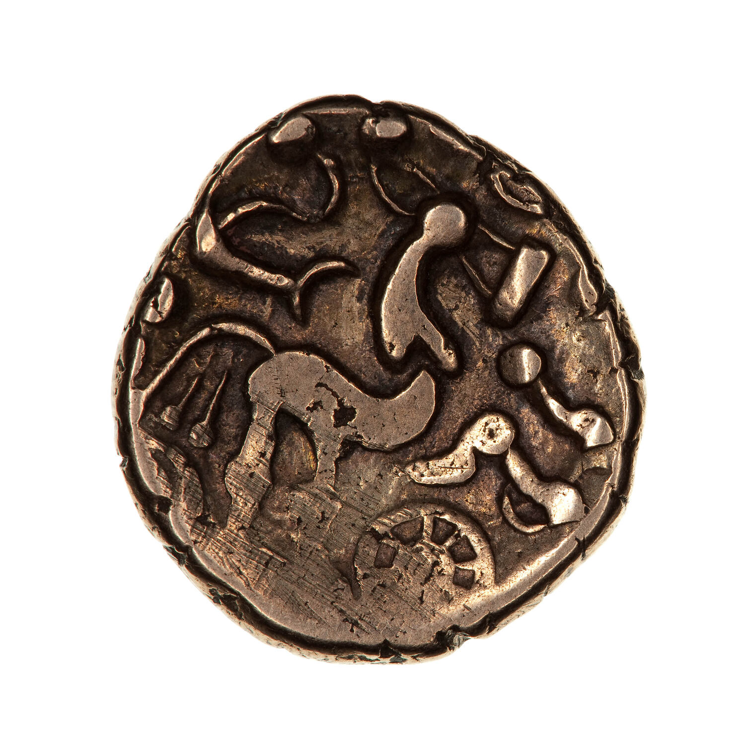In Britain the Atrebates settled in an area around modern Hampshire, Surrey and western Sussex, which had earlier links with migration or invasion from Gaul. Under the influence of Commius they soon came to rule this area. There they struck gold coins which featured on their reverse a horse with a characteristic triple tail some of which bear the name COMMIOS on their reverse. This coin may have had the name but it would be off the flan to the right. There is a suggestion of the base of the second letter O on the edge above the head of the horse.