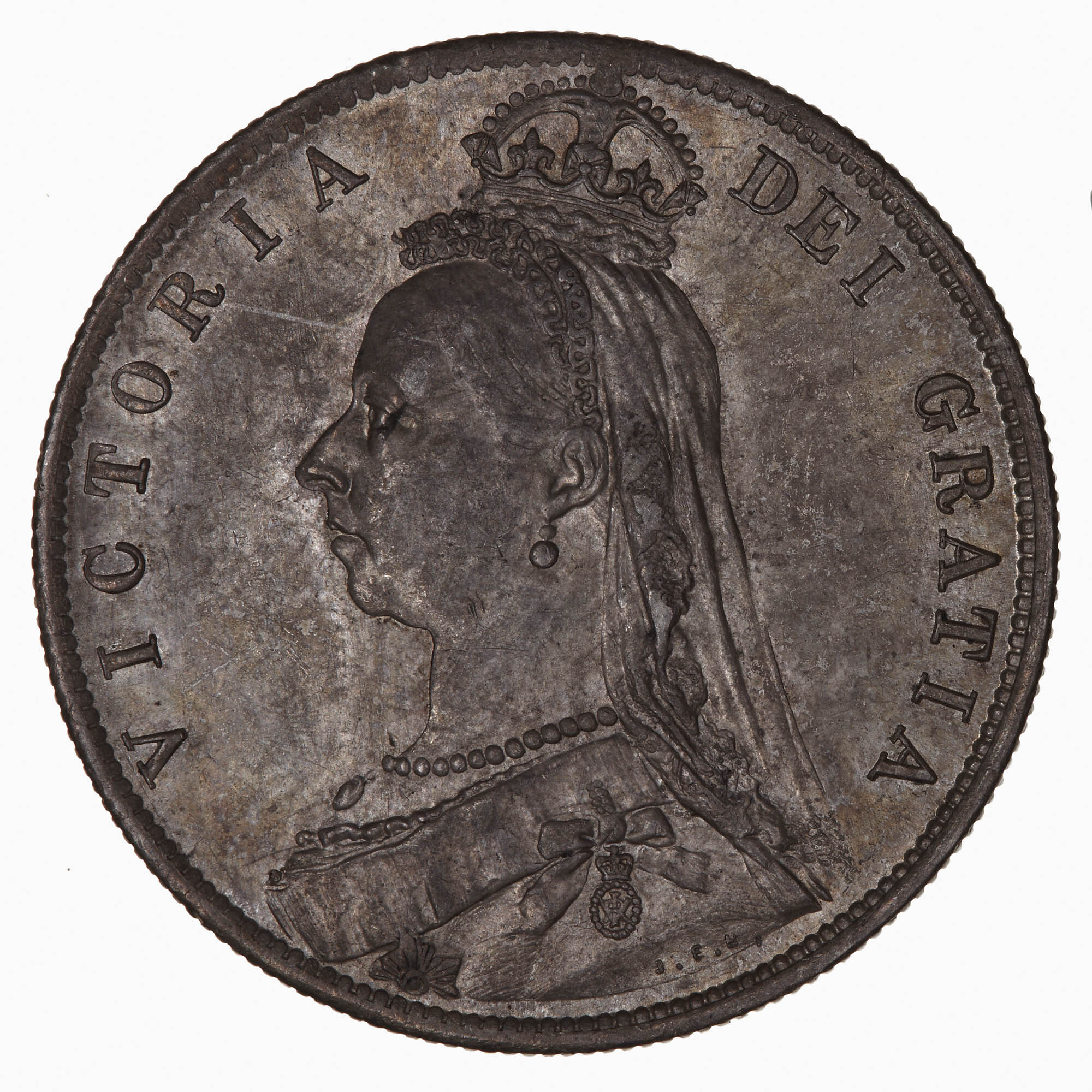Bust of the Queen facing left the small wearing imperial crown, long veil falling behind her head, pearl necklace and earring, Ribbon and Star of the Garter and the badge of the Imperial Order of India; in small raised letters on the bust truncation, the artist's initials J.E.B. (Joseph Edgar Boehm); around, VICTORIA DEI GRATIA