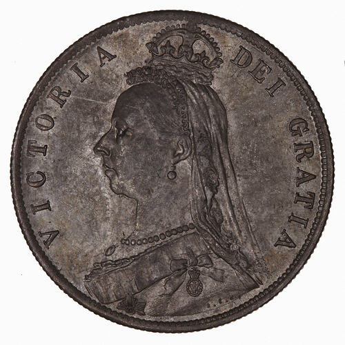 A Halfcrown is a 2 shillings and 6 pence coin. Struck as part of a new coinage introduced for the Golden Jubilee of Queen Victoria, 1837-1887. The coins all shared a new obverse of the Queen, adapted from Boehm's own Jubillee medal. The new head proved unpopular and was replaced in 1893.