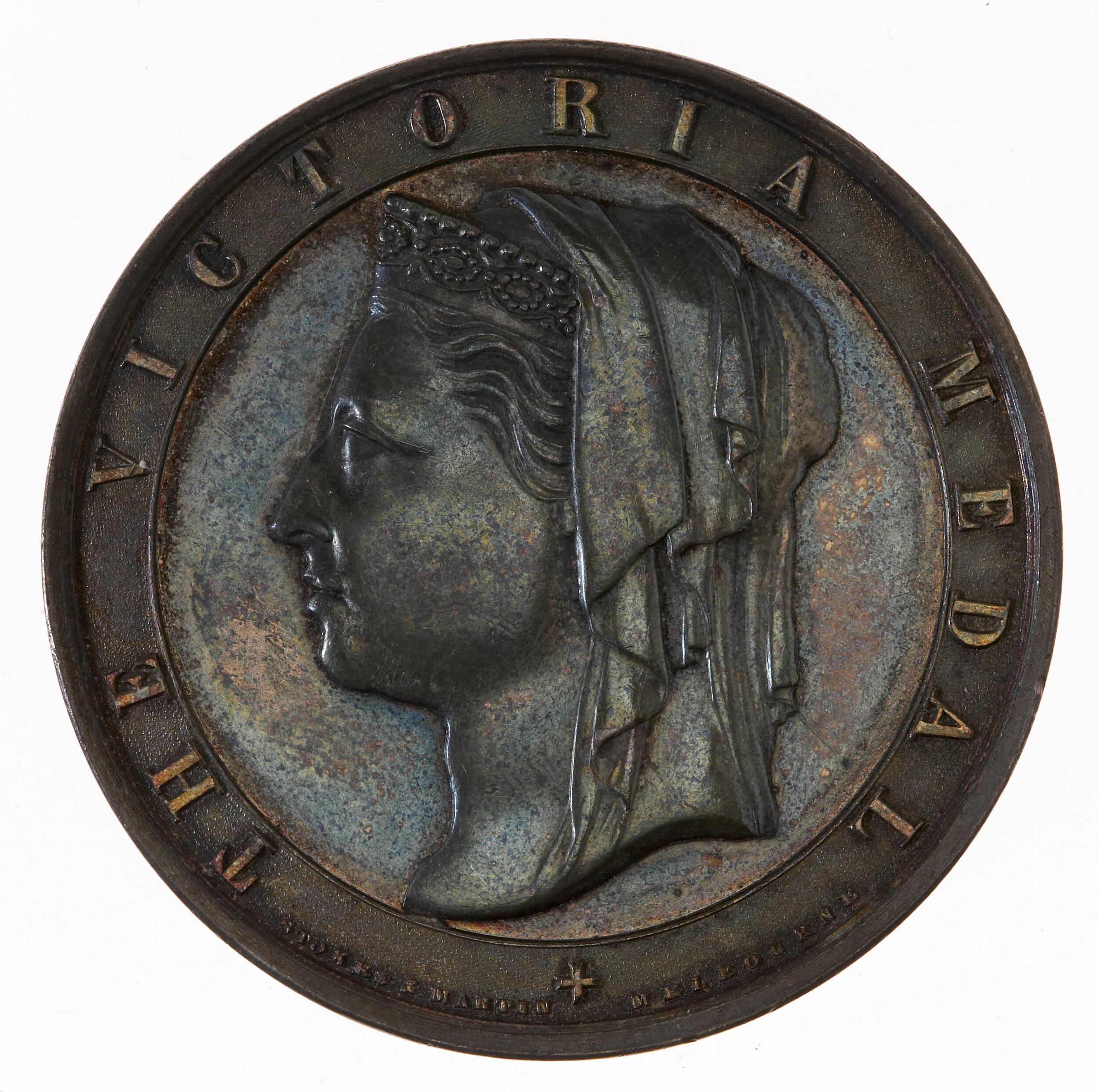 At centre, crowned and veiled head of Queen Victoria facing left; aropund on broad rim, THE VICTORIA MEDAL +; in small letters on either side of cross, STOKES & MARTIN MELBOURNE