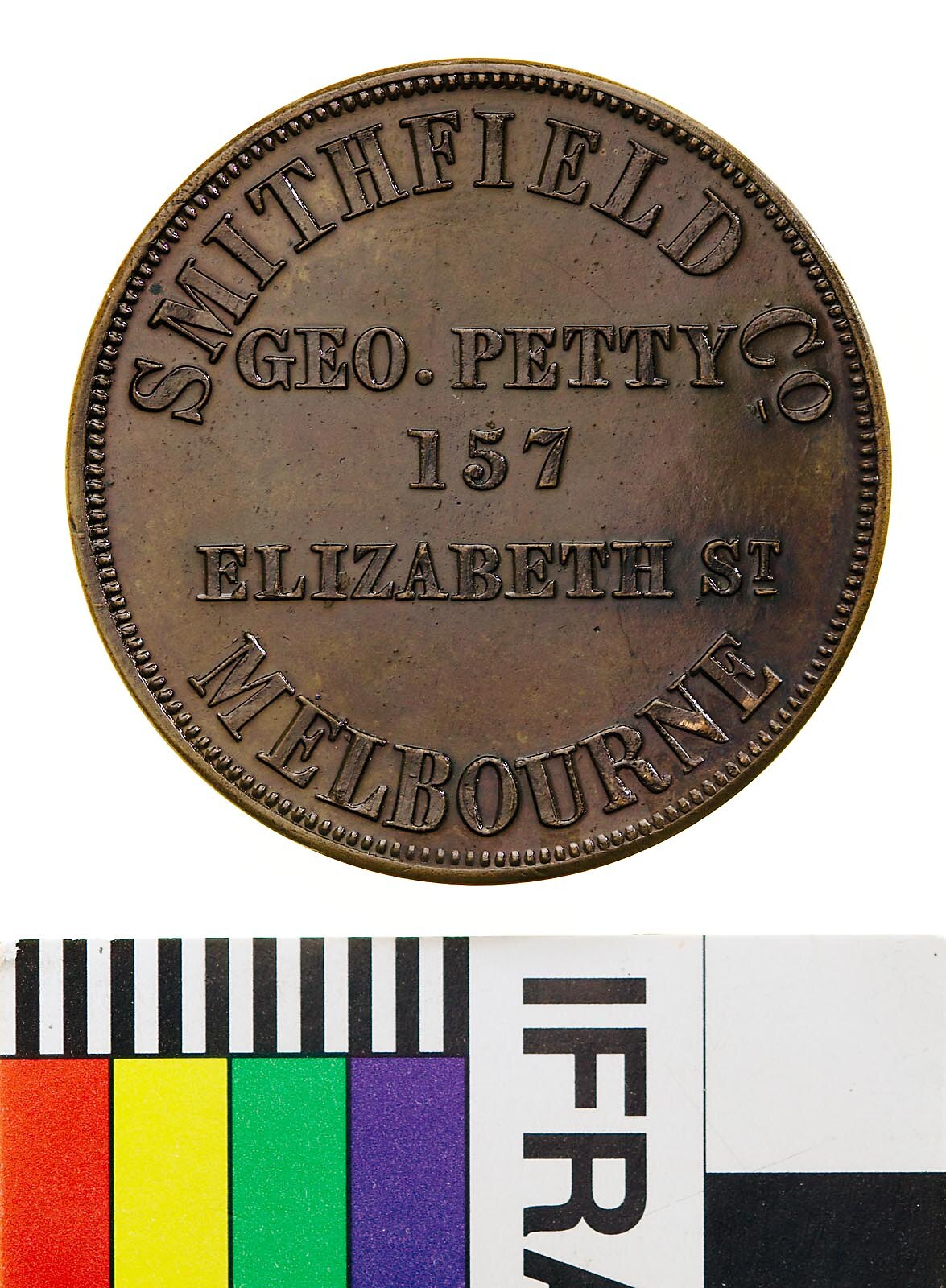 Obverse: SMITHFIELD & Co. GEO. PETTY 157 ELIZABETH ST MELBOURNE Reverse: VICTORIA W.J.TAYLOR LONDON