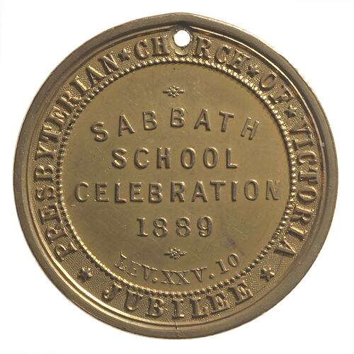 Medal issued to commemorate a Sabbath School 50th jubilee celebration in 1889. It was commissioned by Mrs C. Palmer. 1839 was a signficant year for the Presbyterian Church in Australia. The Church was founded in South Australia that year, and in Melbourne Presbyterians were allotted a two acre site on the corner of Collins Street and Russell Street, on which Scots Church and its manse were built.