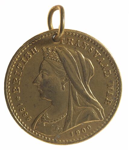 Veiled bust of Queen Victoria facing left; around, * BRITISH TRANSVAAL WAR 1899 1900