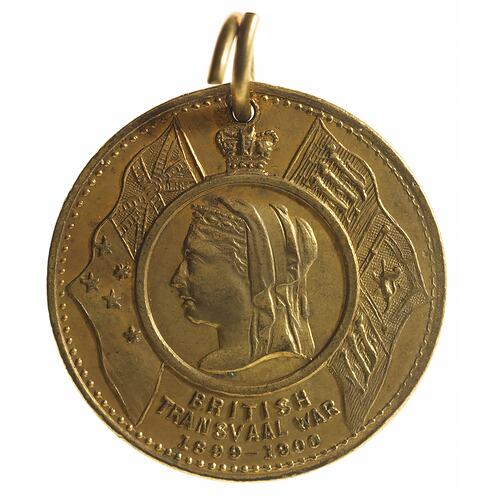 At centre within line circle veiled head of Queen Victoria facing left, at top of circle, crown, at sides Australian and Royal flags; below, BRITISH / TRANSVAAL WAR /; 1899 - 1900