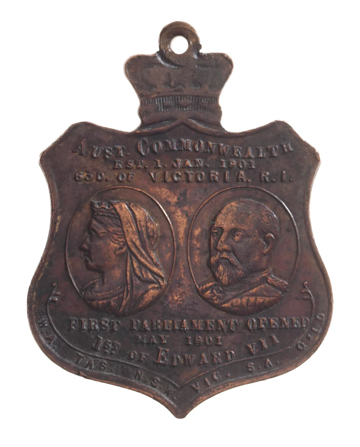 Busts of Queen Victoria and Edward VII; above, AUST. COMMONWEALTH / EST.1.JAN.1901 / 63RD OF VICTORIA, R.I.; below, FIRST PARLIAMENT OPENED / MAY 1901 / 1ST OF EDWARD VII; below, WA TAS NSW VIC SA QLD