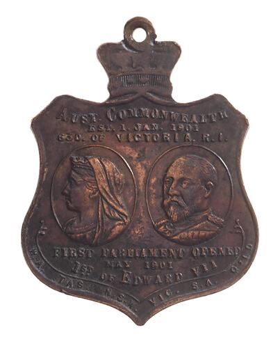 Plain (edge) Busts of Queen Victoria and Edward VII; above, AUST. COMMONWEALTH / EST.1.JAN.1901 / 63RD OF VICTORIA, R.I.; below, FIRST PARLIAMENT OPENED / MAY 1901 / 1ST OF EDWARD VII; below, WA TAS NSW VIC SA QLD (obverse) Busts of Duke and Duchess; above, OPENING OF THE FIRST / FEDERAL PARLIAMENT; below, T.R.H. / THE DUKE & DUCHESS OF CORNWALL / AND YORK / MELBOURNE, MAY 1901(reverse)