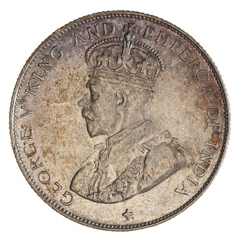 Bust of the King wearing the Imperial crown and an ermine robe with the collar of the Garter and the badge of the Bath; around, GEORGE V KING AND EMPEROR OF INDIA; the artist's initials, BM, on bust truncation