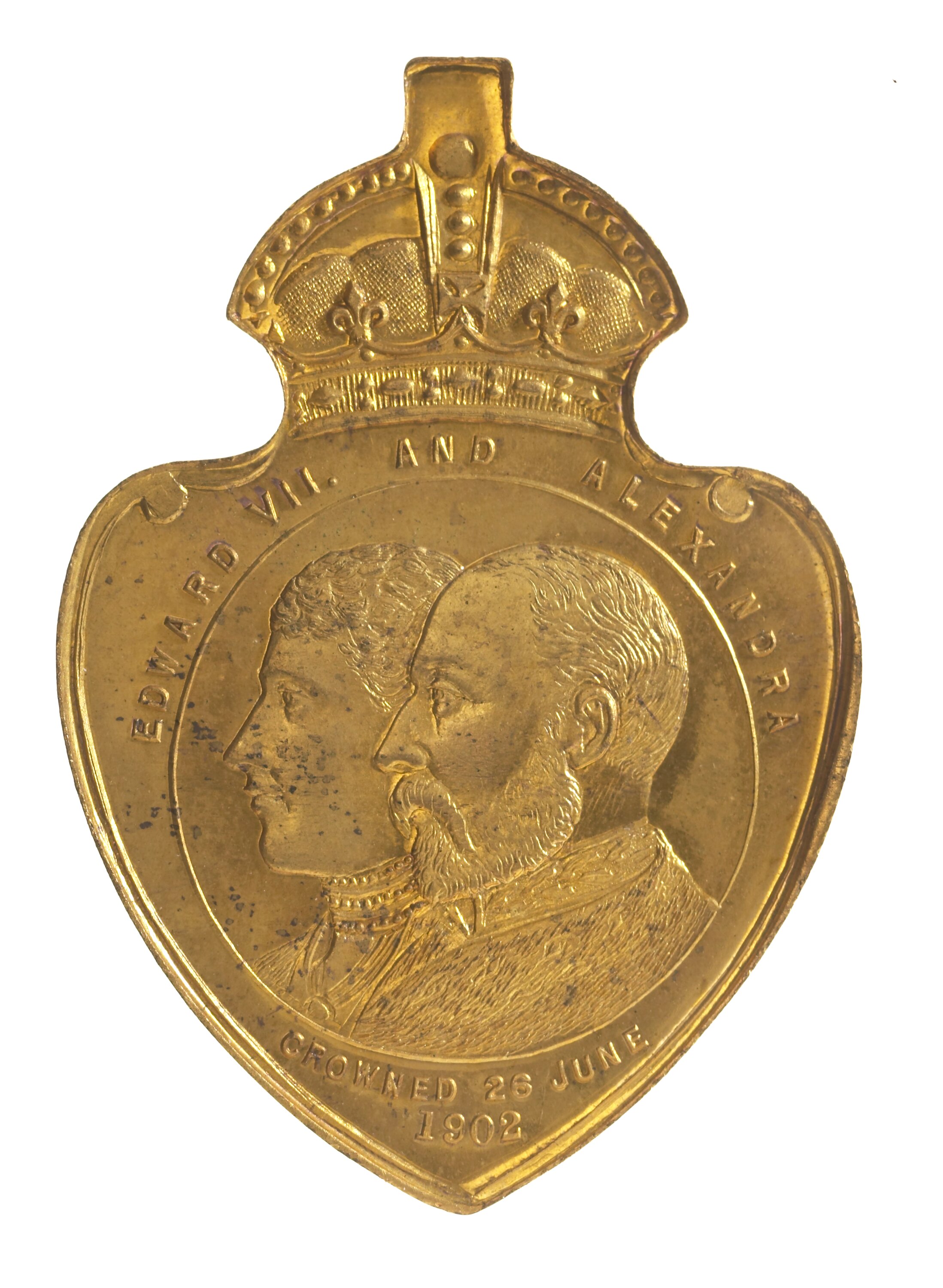 At centre, within line circle conjoined busts of Edward VII and Queen Alexandra; around, EDWARD VII AND ALEXANDRA 0; below, CROWNED 26 JUNE / 1902. Struck on a shield shaped flan with a crown and loop at the top