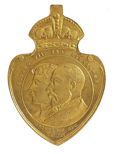 At centre, within line circle conjoined busts of Edward VII and Queen Alexandra; around, EDWARD VII AND ALEXANDRA; below, CROWNED . 9 . AUG. / 1902. Struck on a shield shaped flan with a crown and loop at the top