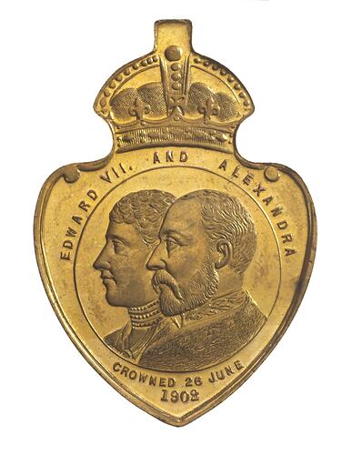 At centre, within line circle conjoined busts of Edward VII and Queen Alexandra; around, EDWARD VII AND ALEXANDRA; below, CROWNED 26 JUNE / 1902. Struck on a shield shaped flan with a crown and loop at the top