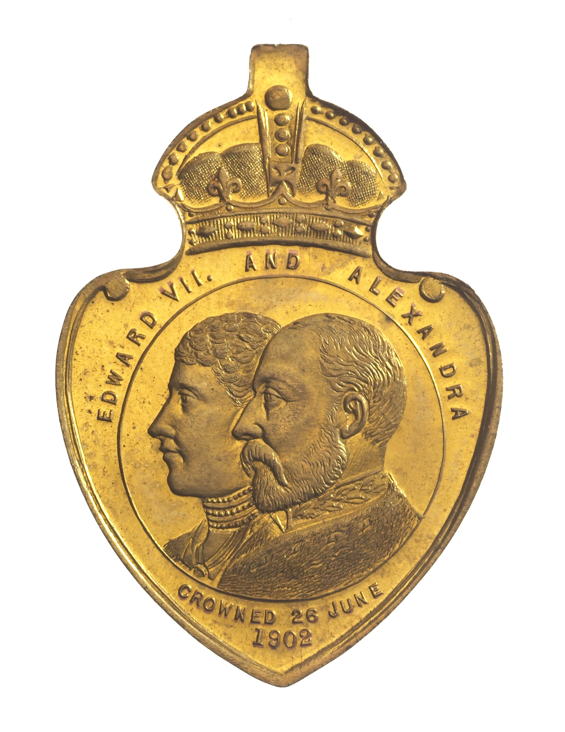 At centre, within line circle conjoined busts of Edward VII and Queen Alexandra; around, EDWARD VII AND ALEXANDRA 0; below, CROWNED 26 JUNE / 1902. Struck on a shield shaped flan with a crown and loop at the top