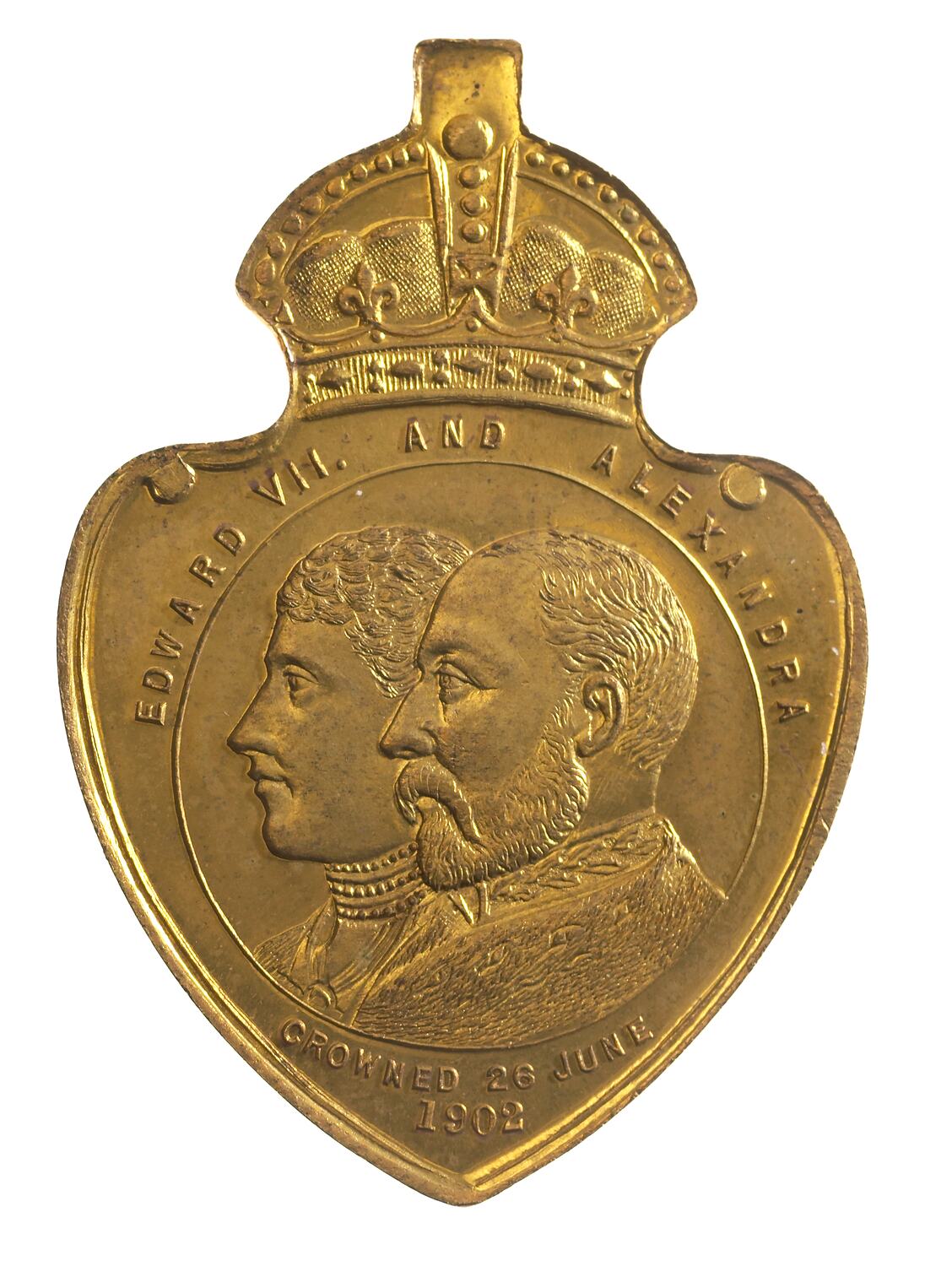 At centre, within line circle conjoined busts of Edward VII and Queen Alexandra; around, 'EDWARD VII AND ALEXANDRA'; below, 'CROWNED 26 JUNE / 1902'. Struck on a shield shaped flan with a crown and loop at the top.