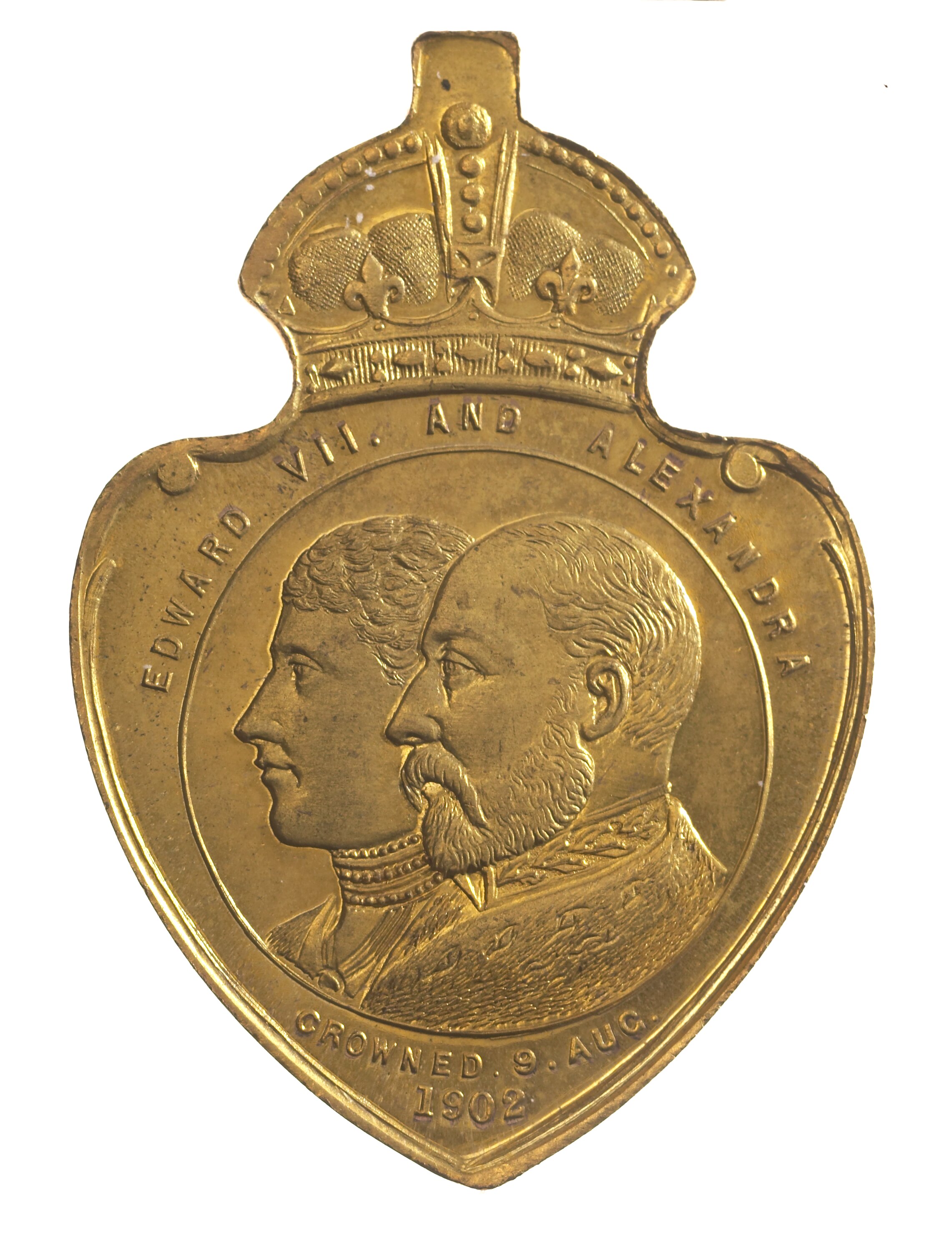 At centre, within line circle conjoined busts of Edward VII and Queen Alexandra; around, EDWARD VII AND ALEXANDRA 0; below, CROWNED . 9 . AUG. / 1902. Struck on a shield shaped flan with a crown and loop at the top