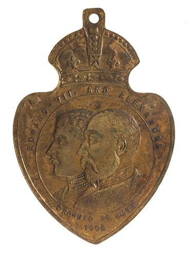 At centre, within line circle conjoined busts of Edward VII and Queen Alexandra; around, 'EDWARD VII AND ALEXANDRA 0'; below, 'CROWNED 26 JUNE / 1902'. Struck on a shield shaped flan with a crown and loop at the top.