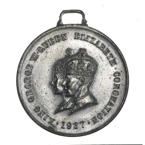 Conjoined crowned busts left; around, KING GEORGE VI . QUEEN ELIZABETH. CORONATION . 1937 . In small letters, P.J. KING / MELB.