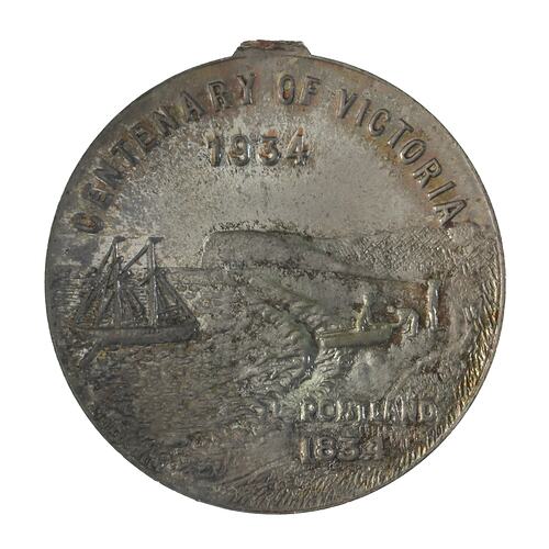 Other Details: Silvered bronze medal issued to commemorate Melbourne's centenary 1934-35. The medal also refers to Portland, the location of Victoria's first settlement. The Henty brothers, entrepreneur farmers and whalers, established the state's first permanent European settlement in Portland in 1834. Melbourne was established the following year by a party of settlers led by John Batman.