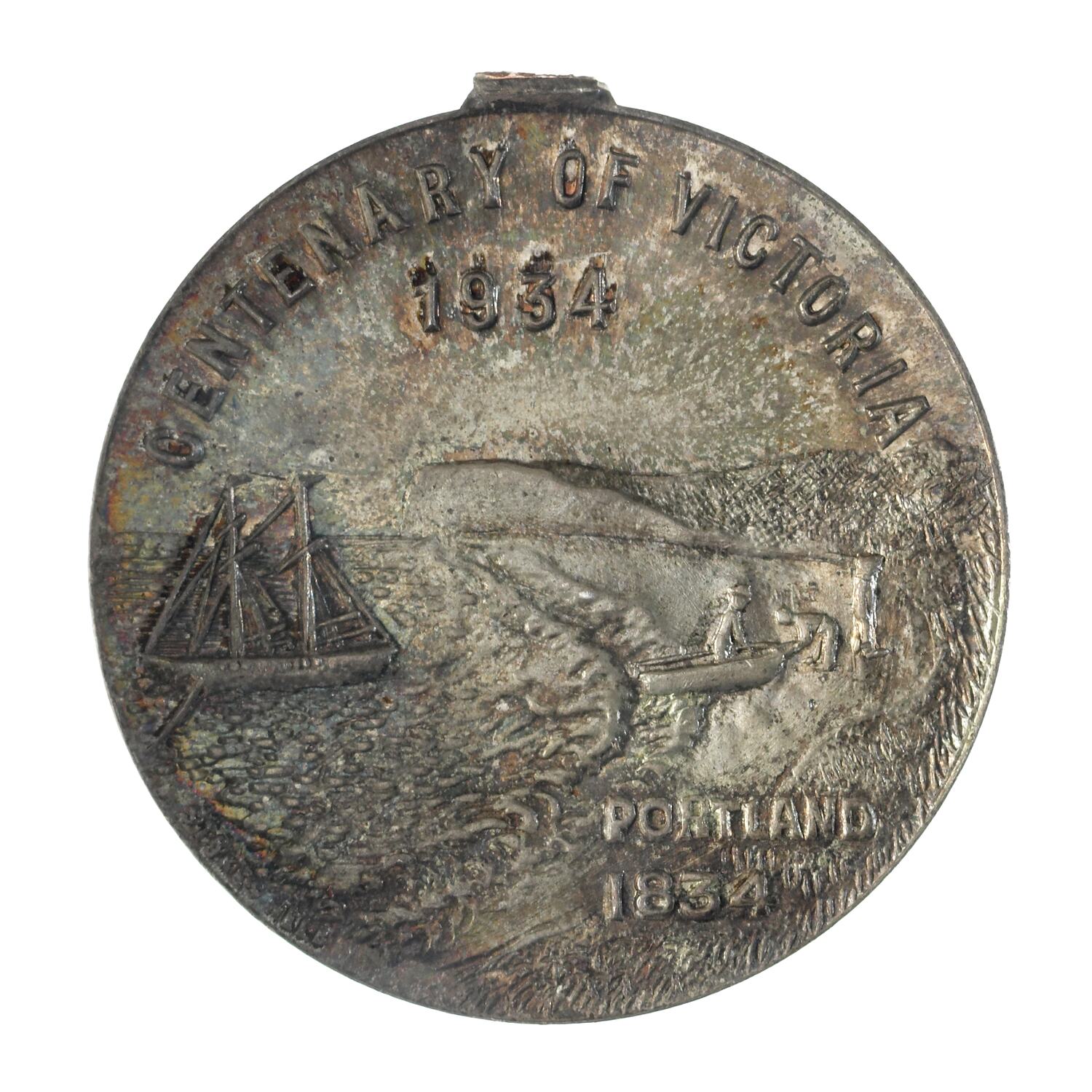 White metal medal issued to commemorate Melbourne's centenary 1934-35. This medal was given out to Victorian school children; 325,600 white metal medals were struck. There were also a few VIP pieces in other metals, including two in gold. The medal references Portland, the location of Victoria's first settlement. The Henty brothers, entrepreneur farmers and whalers, established the state's first permanent European settlement in Portland in 1834. Melbourne was established the following year by a party of settlers led by John Batman.