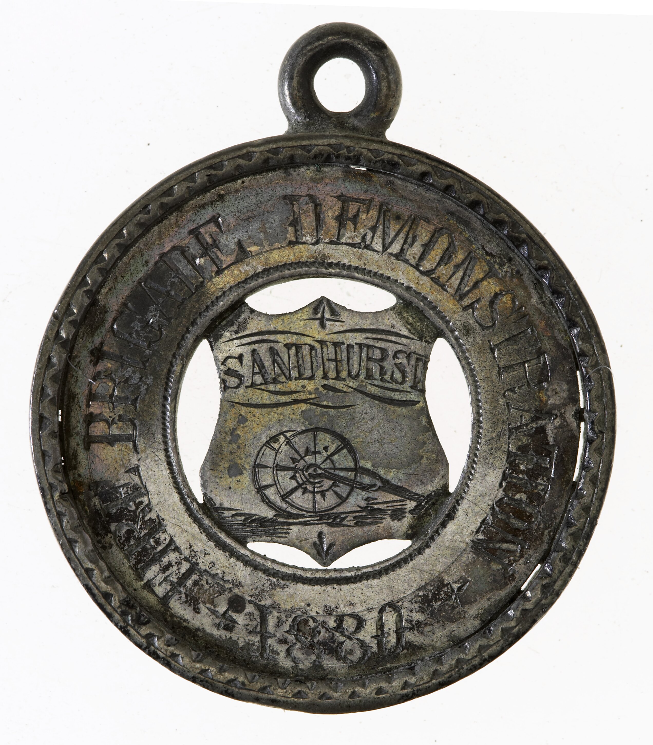 Engraved on shield in centre void, SANDHURST above a hose apparatus; around, FIRE BRIGADE DEMONSTRATION 1880