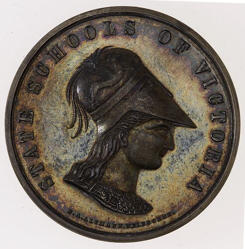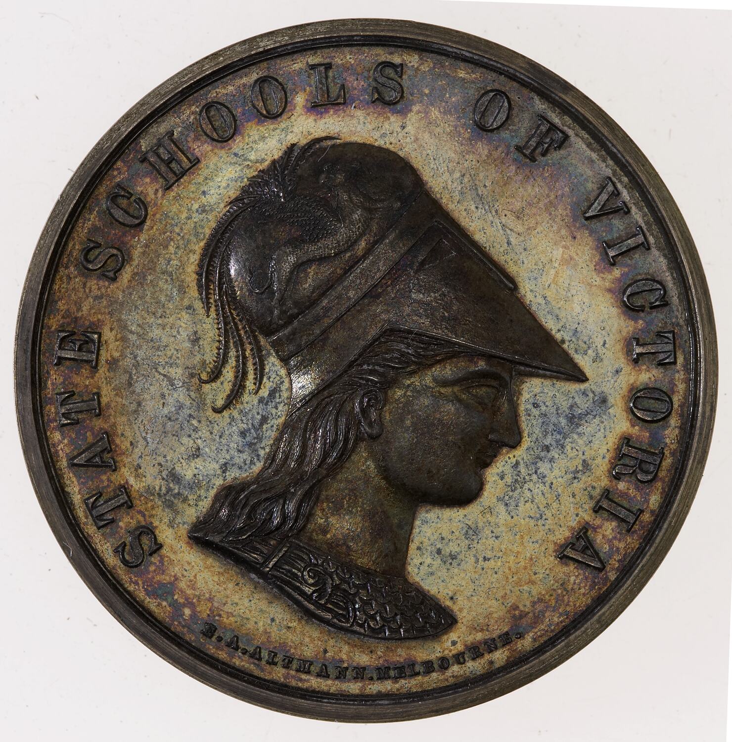Profile bust the ancient Greek goddess Athena facing right, wearing a Corinthian helmet decorated with a griffin; around, STATE SCHOOLS OF VICTORIA; below in small letters, E.A. ALTMANN. MELBOURNE.