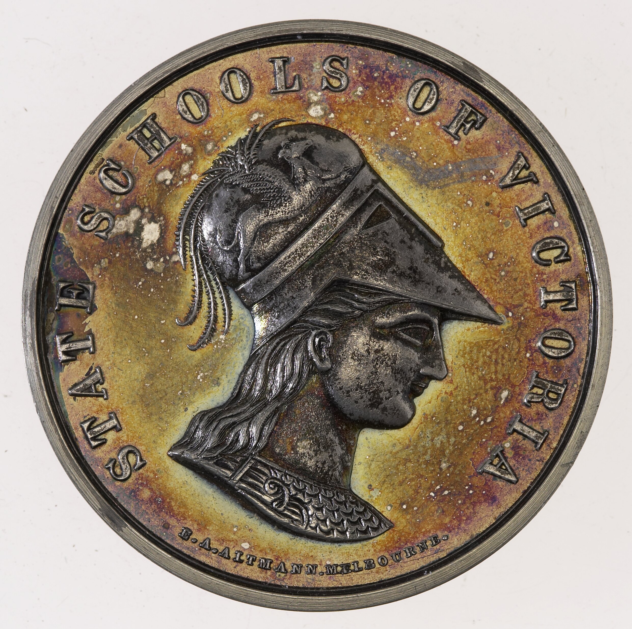 Profile bust the ancient Greek goddess Athena facing right, wearing a Corinthian helmet decorated with a griffin; around, STATE SCHOOLS OF VICTORIA; below in small letters, E.A. ALTMANN. MELBOURNE.