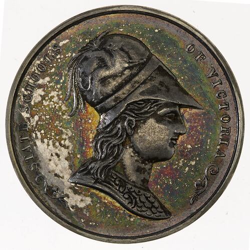 Profile bust the ancient Greek goddess Athena facing right, wearing a Corinthian helmet decorated with a griffin; around, STATE SCHOOLS OF VICTORIA; below in small letters, E.A. ALTMANN. MELBOURNE.