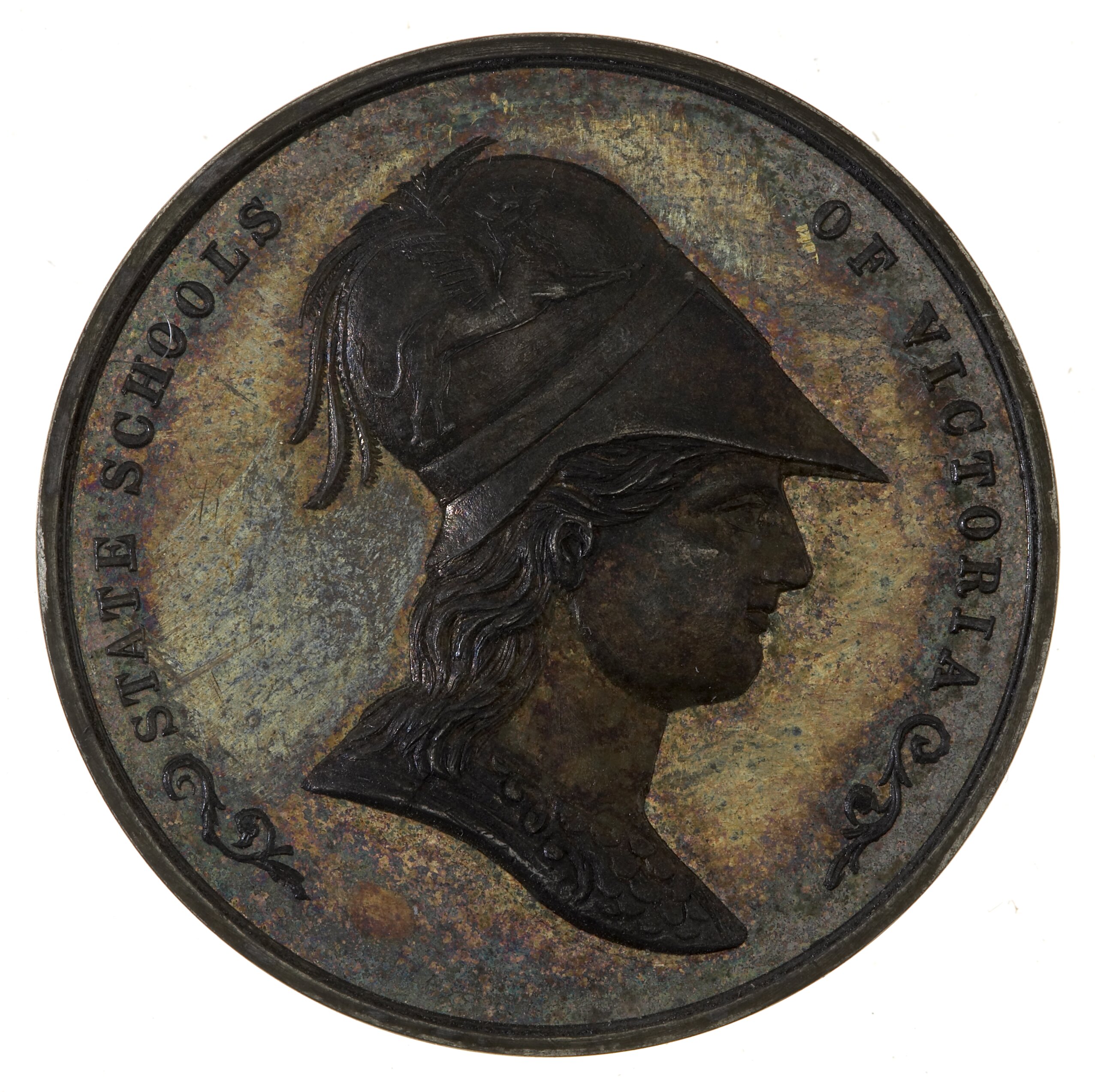 Profile bust the ancient Greek goddess Athena facing right, wearing a Corinthian helmet decorated with a griffin; around, STATE SCHOOLS OF VICTORIA; below in small letters, E.A. ALTMANN. MELBOURNE.