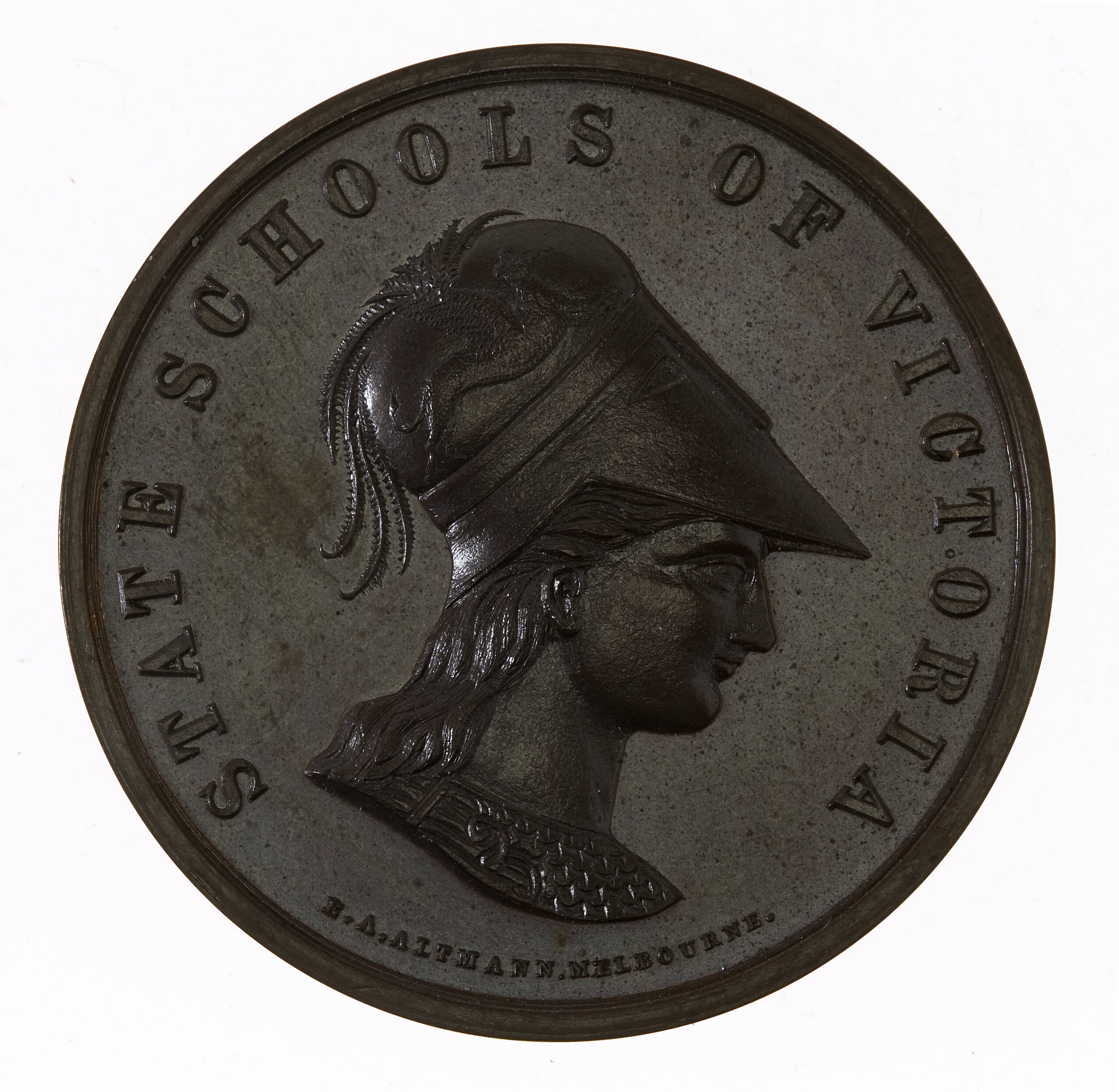 Profile bust the ancient Greek goddess Athena facing right, wearing a Corinthian helmet decorated with a griffin; around, STATE SCHOOLS OF VICTORIA; below in small letters, E.A. ALTMANN. MELBOURNE.
