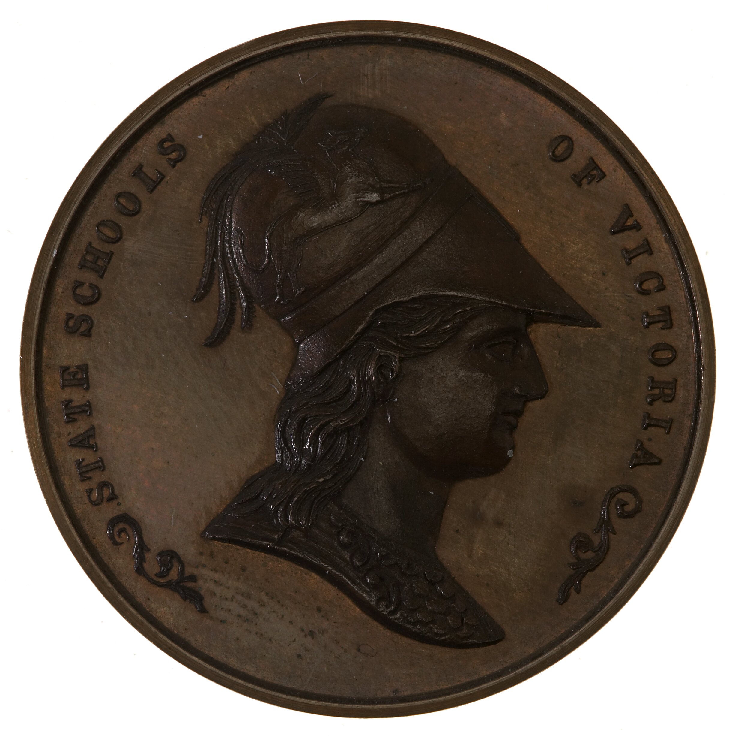 Profile bust the ancient Greek goddess Athena facing right, wearing a Corinthian helmet decorated with a griffin; around, STATE SCHOOLS OF VICTORIA; below in small letters, E.A. ALTMANN. MELBOURNE.