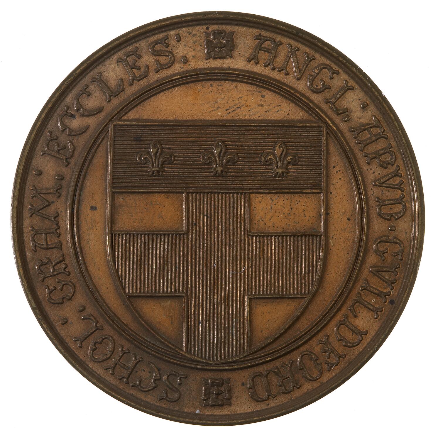School shield, around on broad rim, '+ ANGL: APVD. GUILDFORD * SCHOL: GRAM: ECCLES:'.