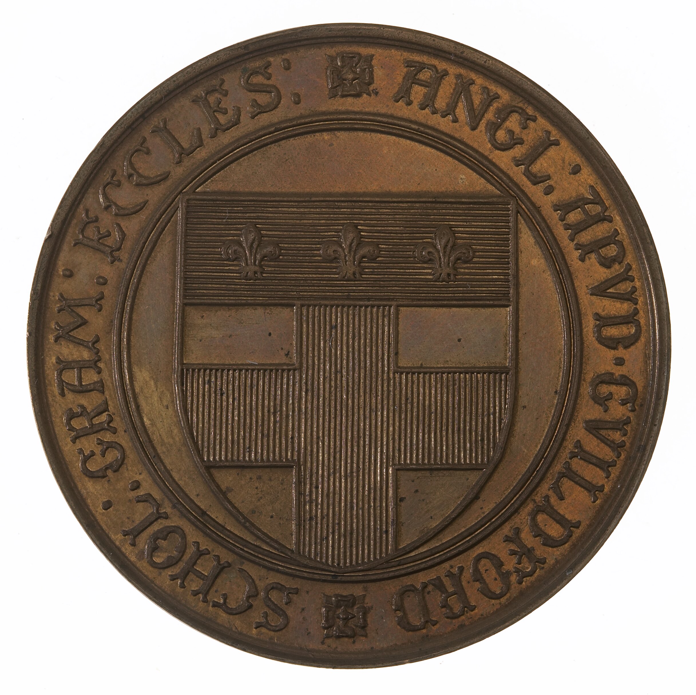 School shield, around on broad rim, + ANGL: APVD. GUILDFORD * SCHOL: GRAM: ECCLES:.