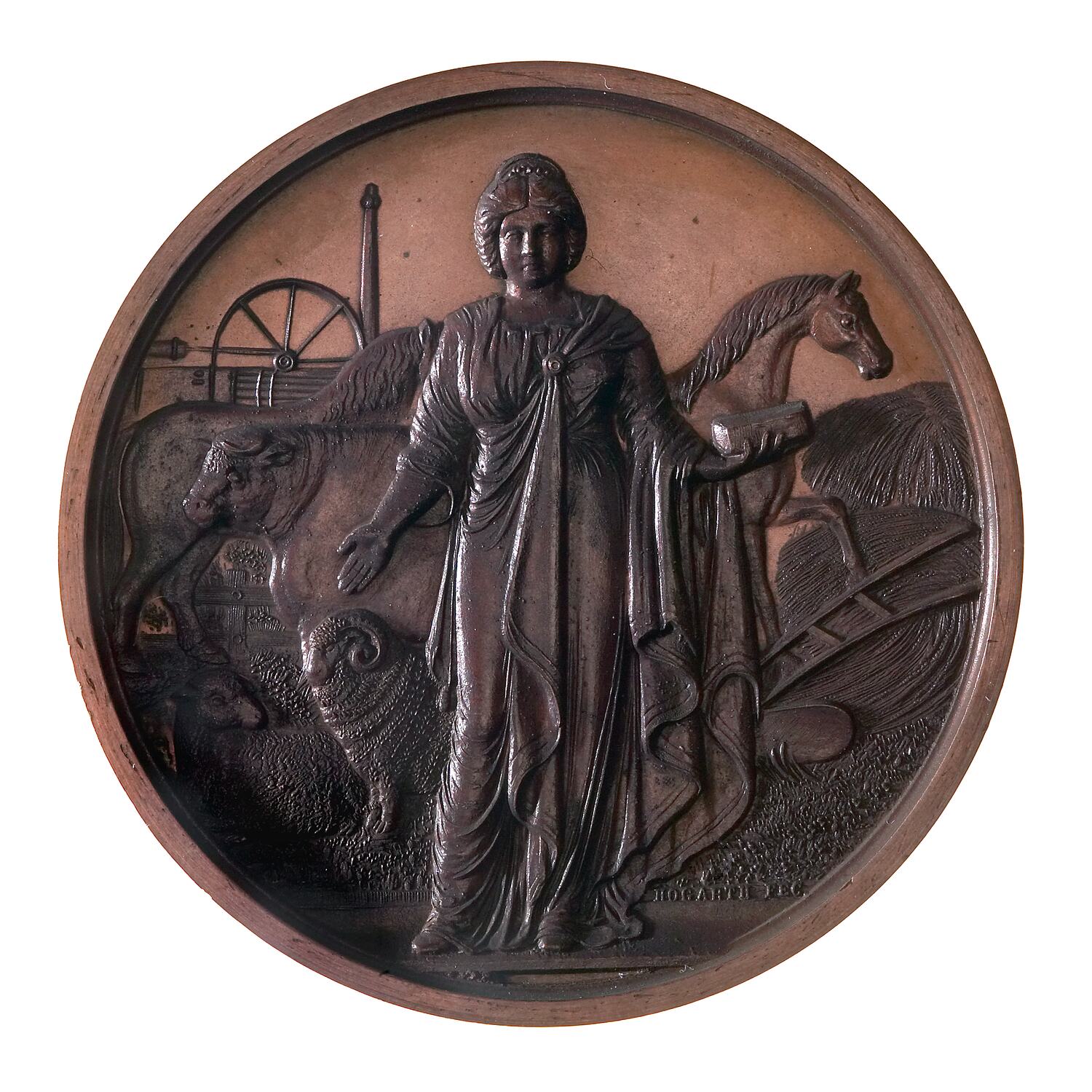 A specimen bronze prize medal (51 mm diameter) of the National Agricultural Society of Victoria by the artist Julius Hogarth; it features Victoria standing facing holding a block of butter and surrounded by agricultural scene